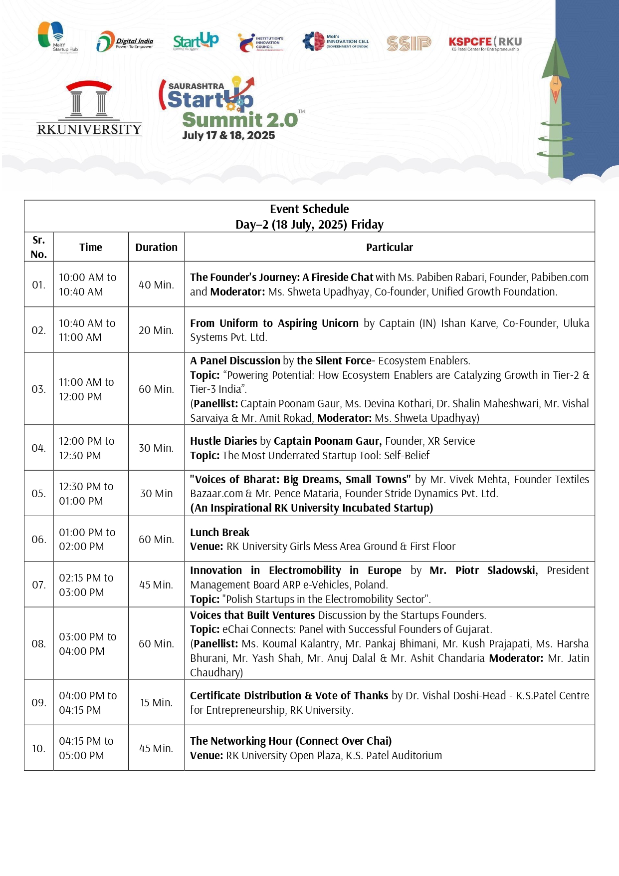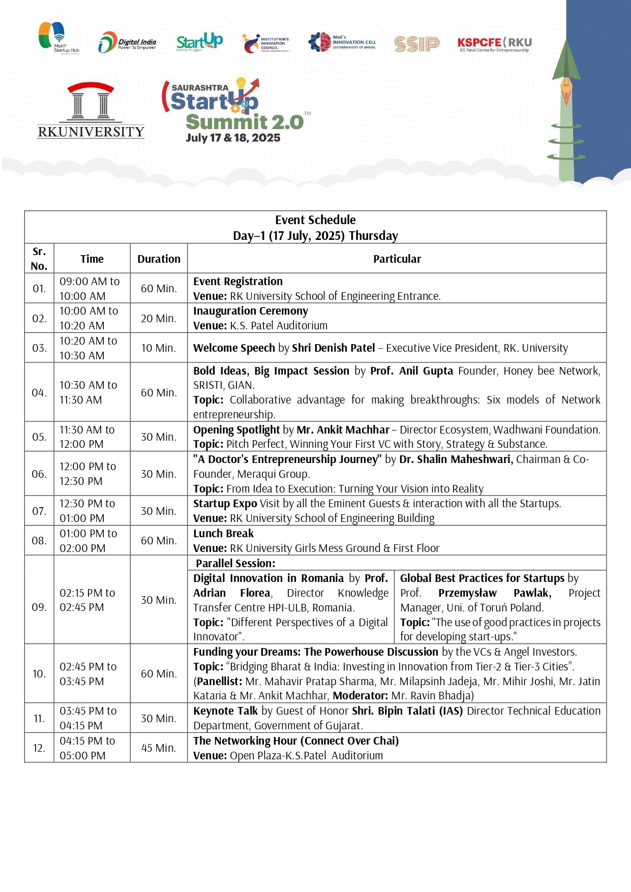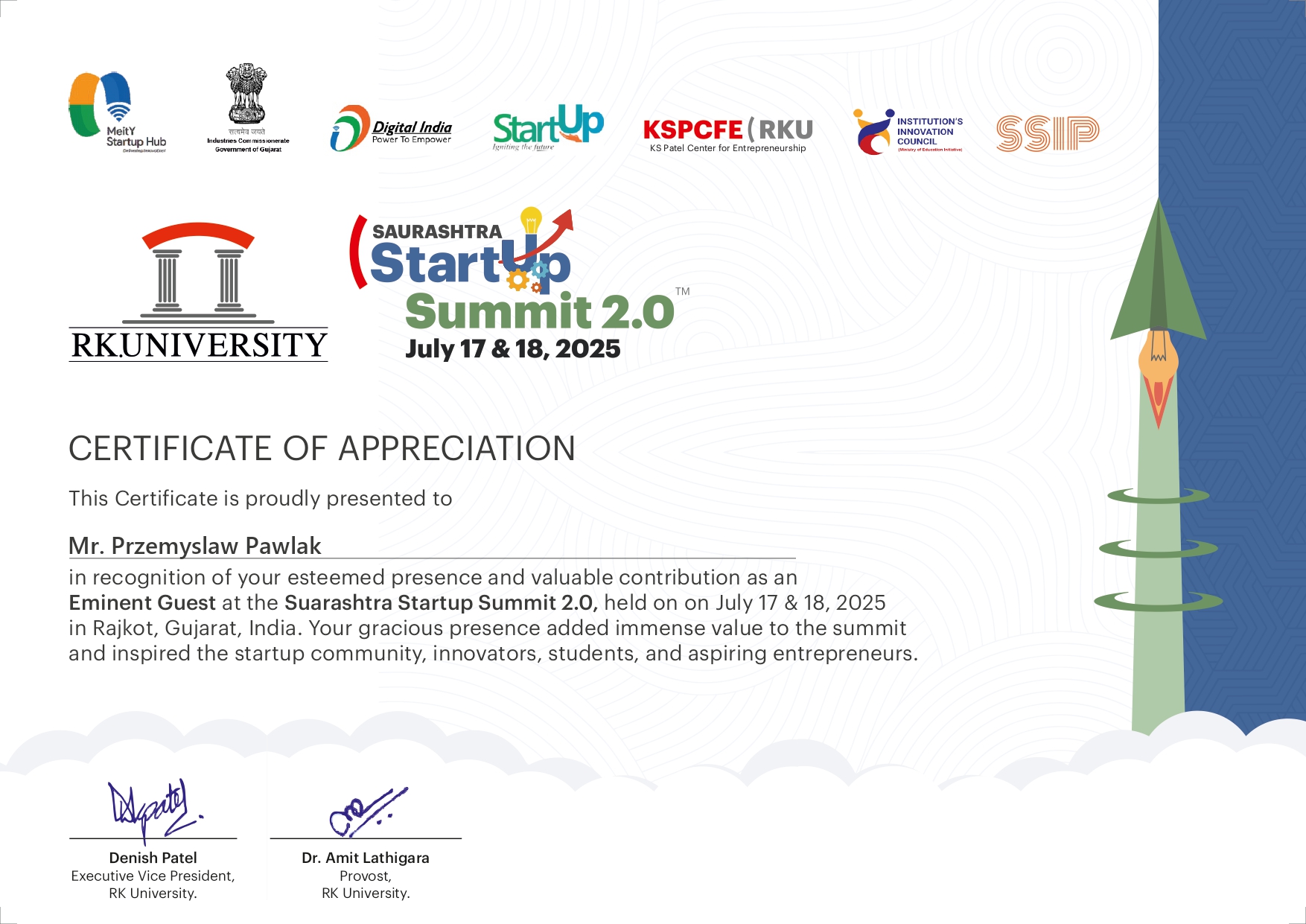 Z dumą informujemy, że Przemysław Pawlak wziął udział w prestiżowym wydarzeniu Saurashtra Startup Summit 2.0, organizowanym przez K S Patel Centre for Entrepreneurship przy RK University (Indie) w dniach 17–18 lipca 2025 roku. Szczyt zgromadził wybitnych liderów startupowego ekosystemu, inwestorów oraz przedsiębiorców z całych Indii, ze szczególnym naciskiem na rozwijający się potencjał współczesnych miast rangi.