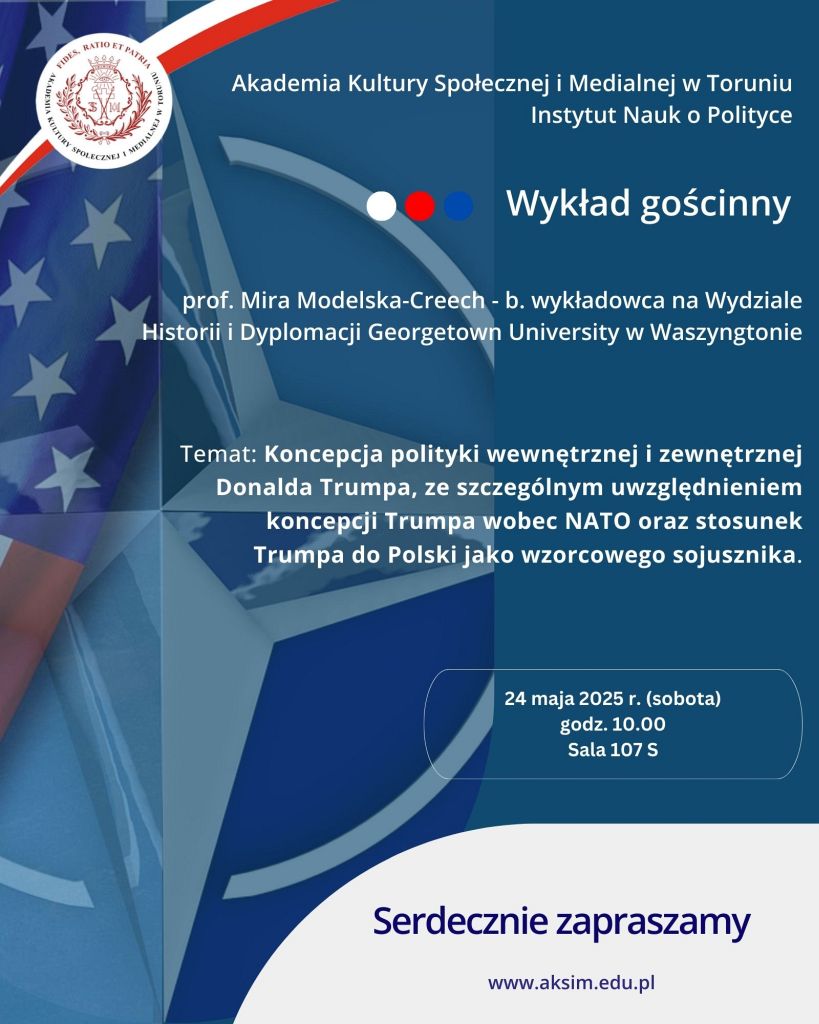 W sobotę 24 maja 2025 r. w Akademii Kultury Społecznej i Medialnej w Toruniu gościła prof. Mira Modelska-Creech, były wykładowca na Wydziale Historii i Dyplomacji Georgetown University w Waszyngtonie. Studenci mieli okazję wysłuchać wykładu na temat „Koncepcja polityki wewnętrznej i zewnętrznej Donalda Trumpa, ze szczególnym uwzględnieniem koncepcji Trumpa wobec NATO oraz stosunek Trumpa do Polski jako wzorcowego sojusznika”.